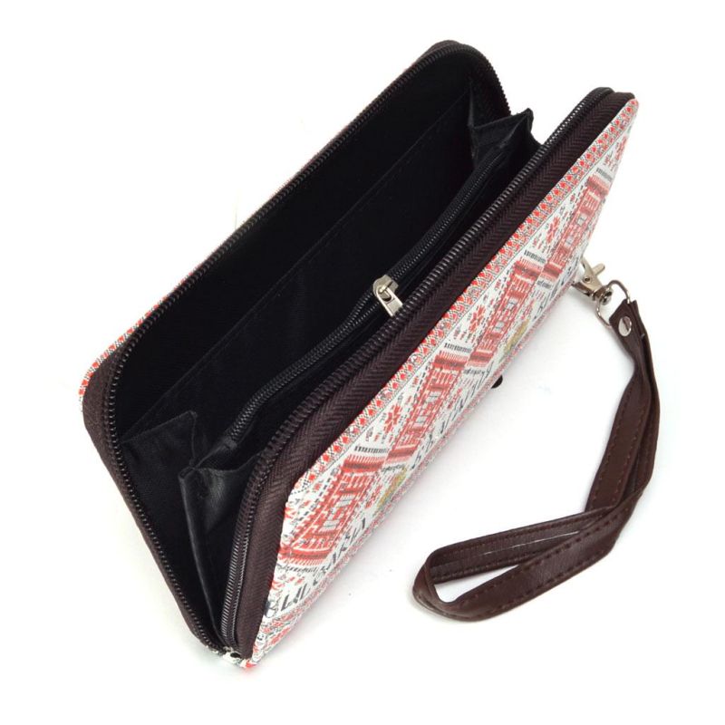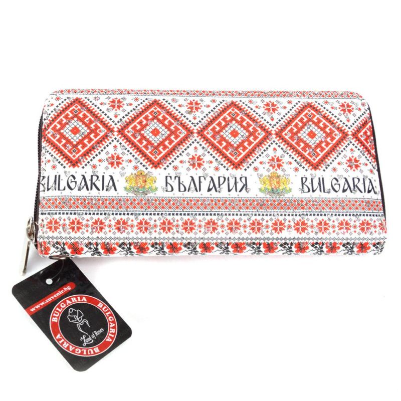 Цветен портфейл от изкуствена кожа, декорирано с български мотиви.