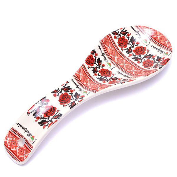 Сувенирна лъжица, декорирана с традиционни български шевици, рози и надпис I ♥ Bulgaria.