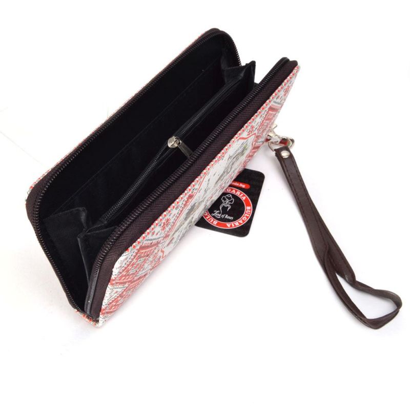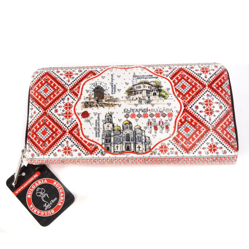 Цветен портфейл от изкуствена кожа, декорирано с български мотиви.