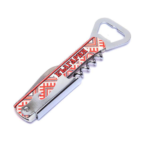 Сувенирен тирбушон с две отварачки, ножче за фолио, декориран с традиционни български шевици и надпис Bulgaria.