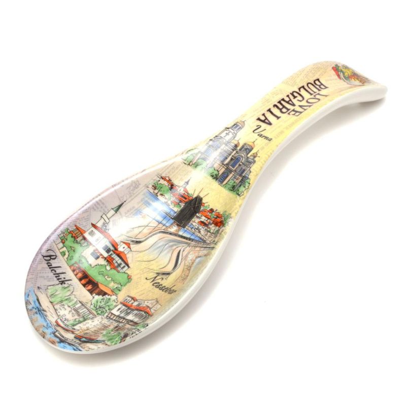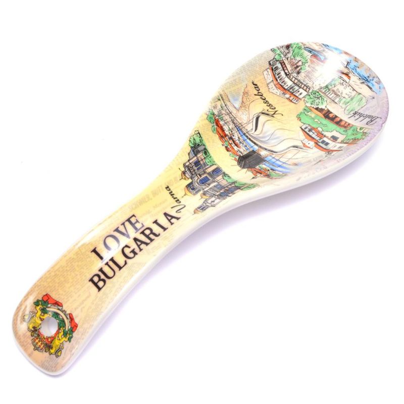 Сувенирна лъжица, декорирана със забележителности от страната и надпис Bulgaria.