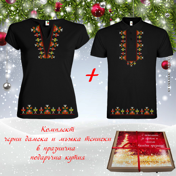 Комплект черни мъжки и дамски висококачествени тениски с народни мотиви.