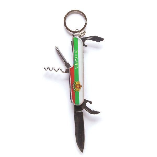 Ключодържател джобно ножче, декорирано със знамето и герба на България, надпис Bulgaria.